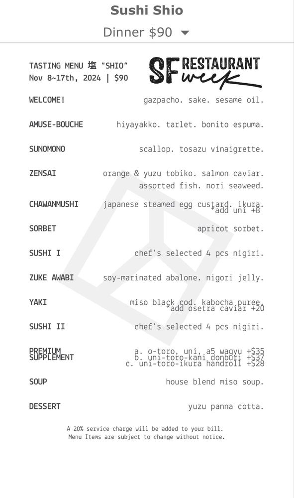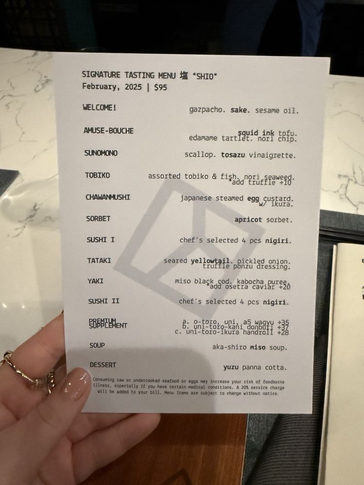 Welcome to Sushi Shio, an exquisite destination for Japanese cuisine nestled in the heart of San Francisco. This upmarket eatery offers a diverse menu tailored for seafood enthusiasts, including pescatarian and limited vegetarian options. Diners can indulge in the elegantly crafted Chef's Selection Tasting, featuring premium fish like Fatty Tuna Belly and A5 Wagyu, paired beautifully with seasonal nigiri options.